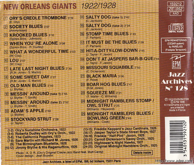 JAZZCD名称:New Orleans Giants 1922-1928 艺术家名称:Various Artists发行公司:Jazz Archives 发行编号:159212发行日期:1998年