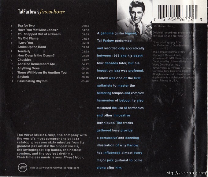 JAZZCD名称:Tal Farlow's Finest Hour 艺术家名称:Tal Farlow发行公司:Verve发行编号:314549677-2发行日期:2001年