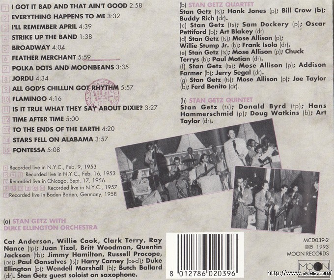 JAZZCD名称:Stan Getz 艺术家名称:The Golden Years, Vol. 1 1952-1958 发行公司:MOON RECORDS发行编号:MCD039-2发行日期:1993年