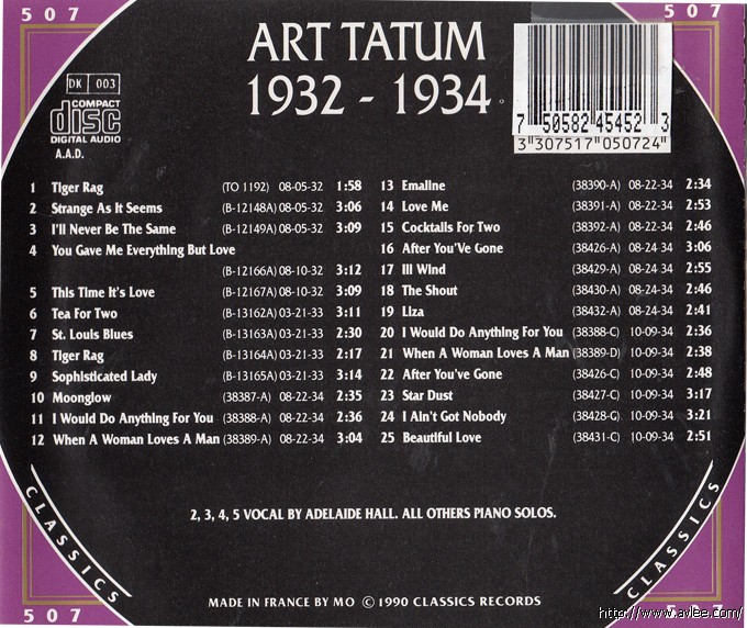 JAZZCD名称:Chronogical Classics 1932-1934艺术家名称:Art Tatum发行公司:CLASSICS发行编号:507发行日期:1990年