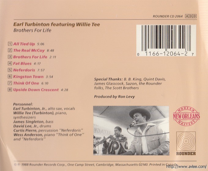 JAZZCD名称:Brothers For Life 艺术家名称:Earl Turbinton Featuring Willie Tee发行公司: Rounder Records 发行编号:CD 2064发行日期:1988年