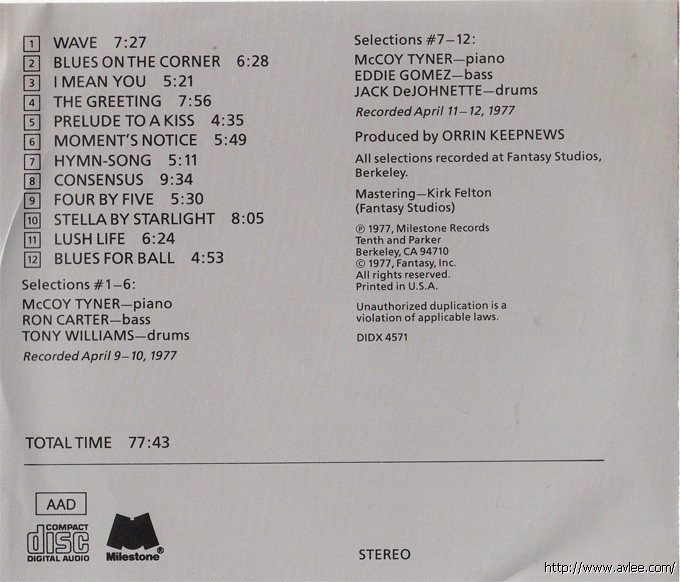 JAZZCD名称:Supertrios 艺术家名称:McCoy Tyner 发行公司:Milestone 发行编号:MCD-55003-2发行日期:1977年