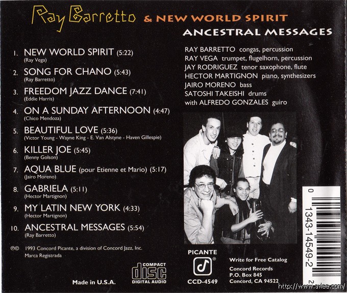 JAZZCD名称:Ancestral Messages 艺术家名称:Ray Barretto 发行公司:Concord Records 发行编号:CCD-4549发行日期:1993年