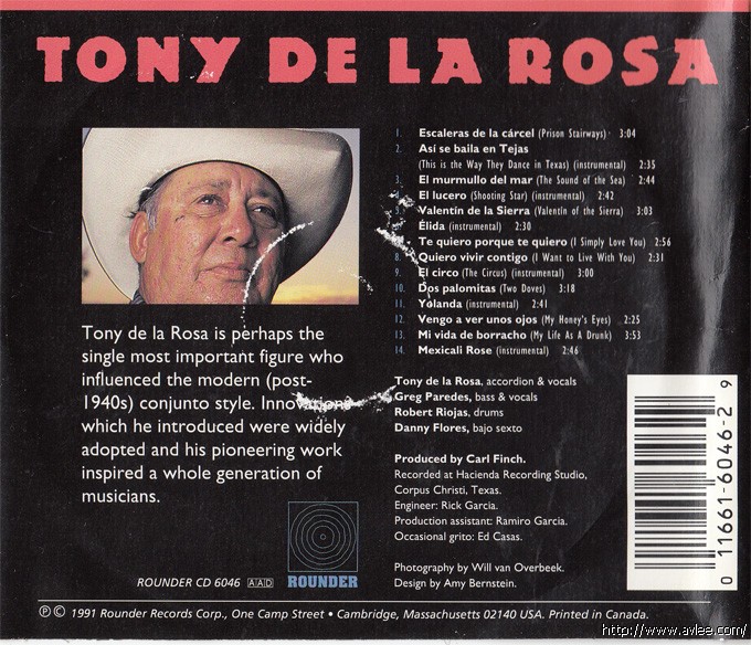 JAZZCD名称:Asi se baila en Tejas艺术家名称:Tony De La Rosa 发行公司:ROUNDER发行编号:CD 6046发行日期:1991年