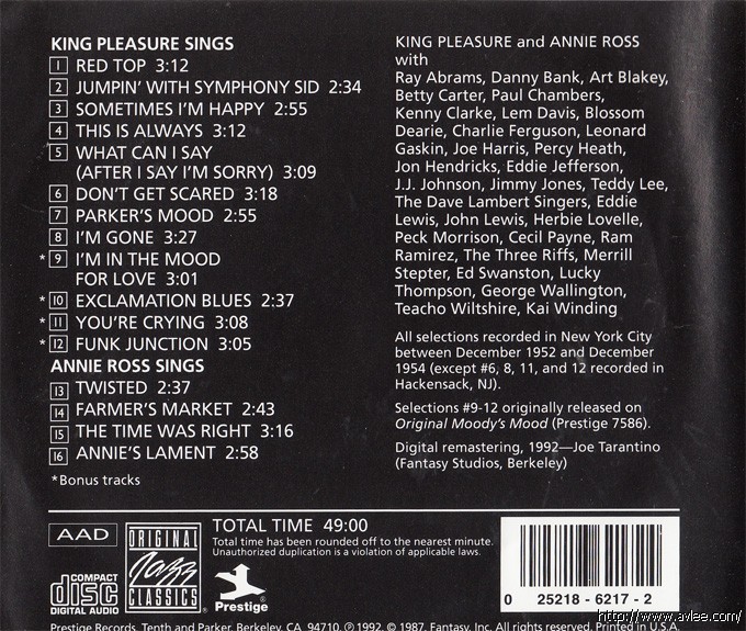JAZZCD名称:King Pleasure Sings/Annie Ross sings 艺术家名称:Annie Ross, King Pleasure 发行公司:PRESTIGE RECORDS发行编号:OJCCD-217-2发行日期:1992年