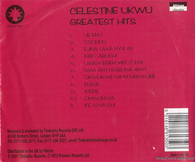 JAZZCD名称:GREATEST HITS 艺术家名称:CELESTINE UKWU 发行公司:TIMBUKTU 发行编号:FL TRCD532 发行日期:1997年 唱片美图: