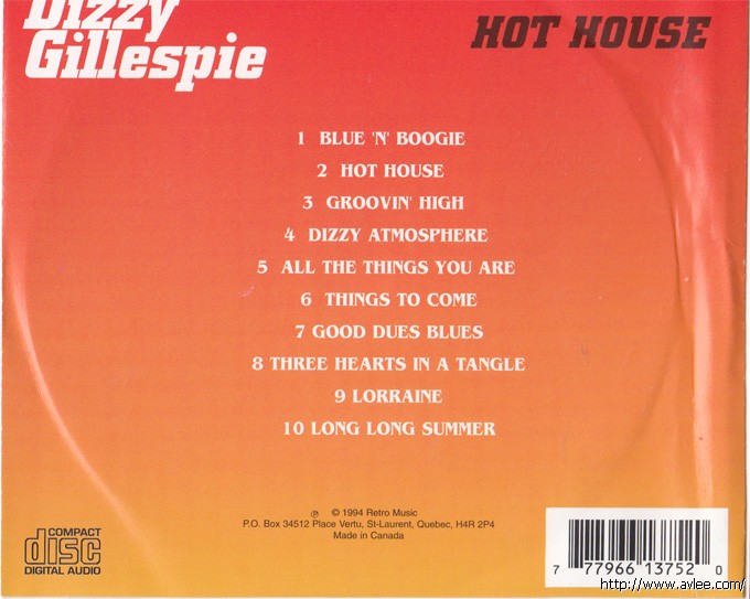 JAZZCD名称:Hot House 艺术家名称:Dizzy Gillespie发行公司:RETRO MUSIC发行编号:SLD13752发行日期:1994年