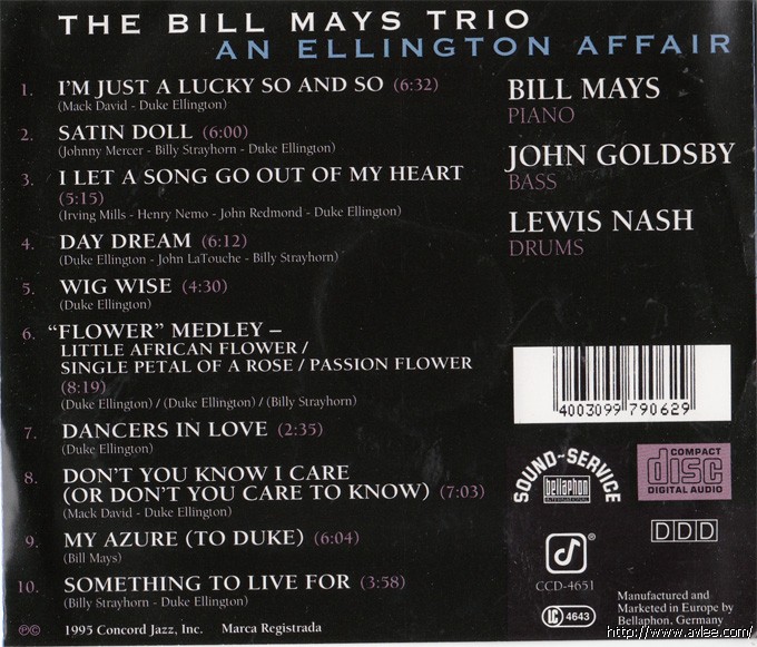 JAZZCD名称:Ellington Affair艺术家名称:Bill Mays Trio发行公司:Concord Records发行编号:CCD-4651发行日期:1995年