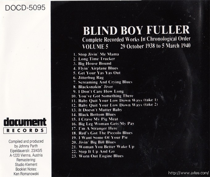 JAZZCD名称:Blind Boy Fuller Vol.5 1938-1940艺术家名称:Blind Boy Fuller发行公司:Document Records发行编号:DOCD-5095发行日期:1992年