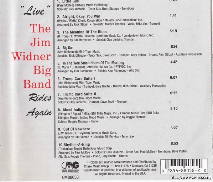 JAZZCD名称:“Live”, The Jim Widner Big Band Rides Again艺术家名称:Jim Widner Big Band 发行公司:CHASE MUSIC GROUP发行编号:CMD8058发行日期:2000年