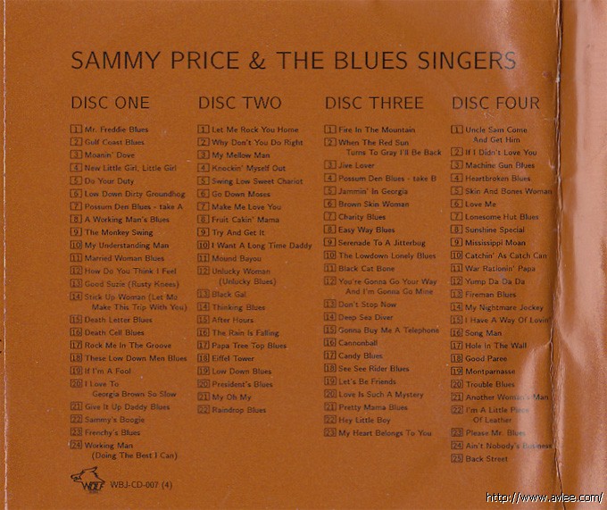 JAZZCD名称:Sammy Price and the Blues Singers艺术家名称:Sammy Price发行公司:WOLF发行编号:WBJ-CD-007发行日期:1998年