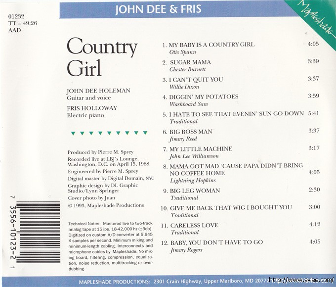 JAZZCD名称:Country Girl 艺术家名称:John Dee & Fris发行公司:Mapleshade Records 发行编号:01232发行日期:1993年