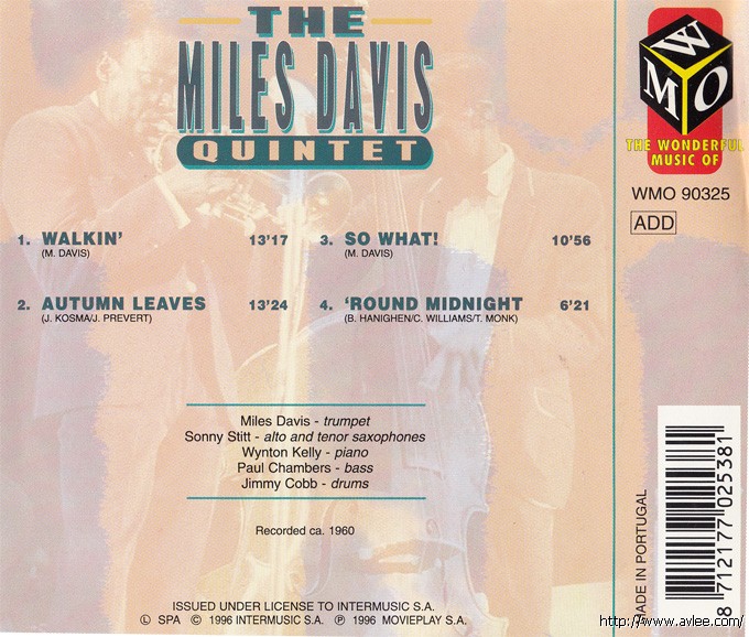JAZZCD名称:The Miles Davis Quintet 艺术家名称:Miles Davis发行公司: THE WONDERFUL MUSIC OF发行编号:WMO 90325发行日期:1996年