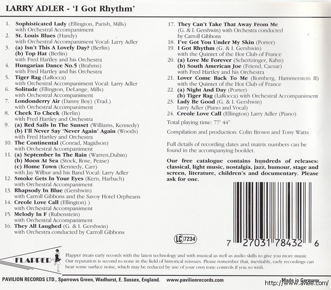 JAZZCD名称:I Got Rhythm 艺术家名称:Larry Adler发行公司:Flapper rteats early发行编号:past 7843发行日期:2001年
