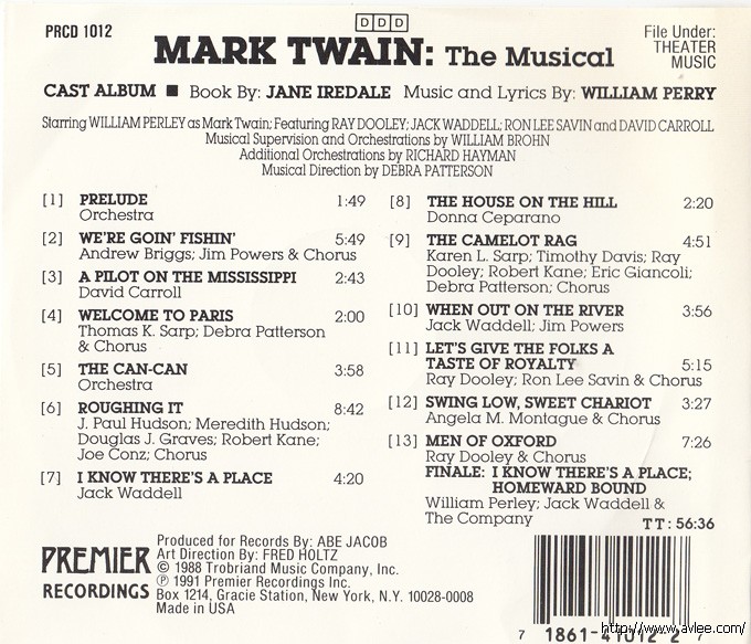 JAZZCD名称:Mr. Mark Twain: The Musical艺术家名称:Mark Twain发行公司:PREMIER发行编号:PRCD 1012发行日期:1991年