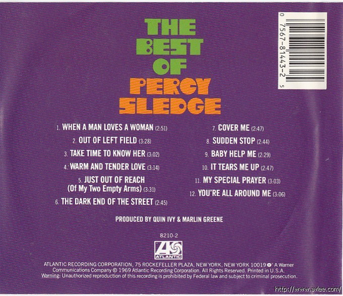 JAZZCD名称:Best of 艺术家名称:Percy Sledge 发行公司:ATLANTIC 发行编号:8210-2 发行日期:1969年 唱片美图: