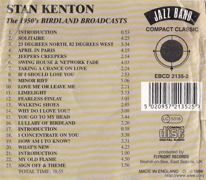 JAZZCD名称:1950s Birdland Broadcasts艺术家名称:Stan Kenton发行公司:Jazz Band发行编号:EBCD 2135-2发行日期:1998年