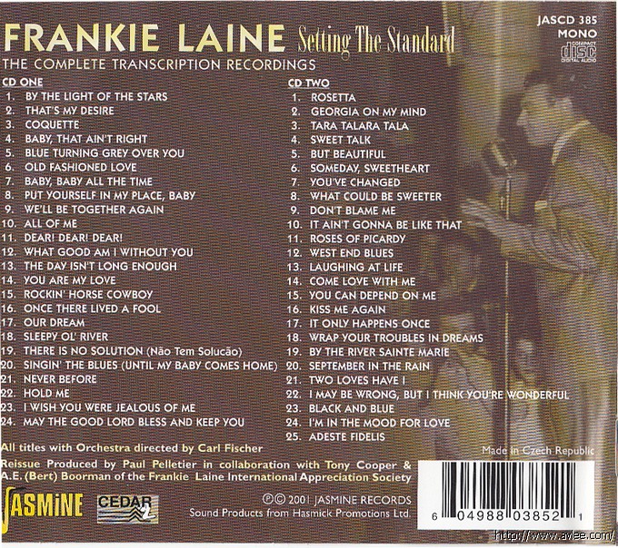 JAZZCD名称:Setting The Standard艺术家名称:Frankie Laine发行公司: Jasmine 发行编号:JASCD 385发行日期:2001年