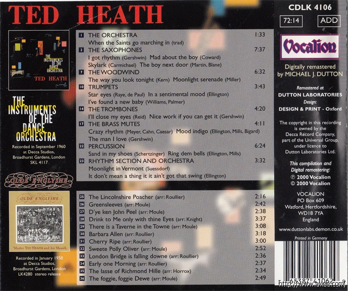 JAZZCD名称:The Instruments of the Dance Orchestra/Olde Englyshe 艺术家名称:Ted Heath发行公司:VOCALION 发行编号:CDLK 4106发行日期:2000年