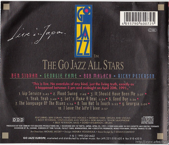 JAZZCD名称:Go Jazz All Stars: Live in Japan 艺术家名称:Various Artists发行公司:Go Jazz Records发行编号:GOJ 60072发行日期:1995年
