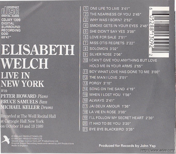 JAZZCD名称:Live in New York艺术家名称:Elisabeth Welch发行公司:JAY PRODUCTIONS LTD发行编号:CDJAY 1309发行日期:1998年
