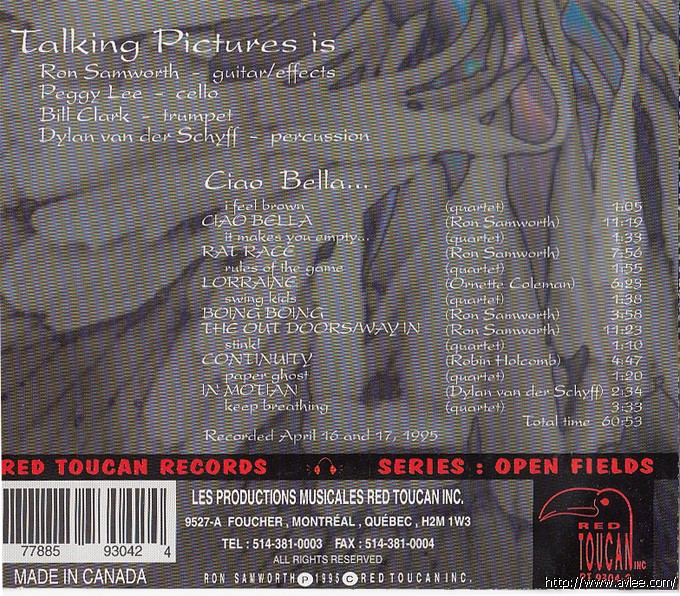 JAZZCD名称:Ciao Bella艺术家名称:Talking Pictures发行公司:Red Toucan发行编号:RT 9304-2发行日期:1995年