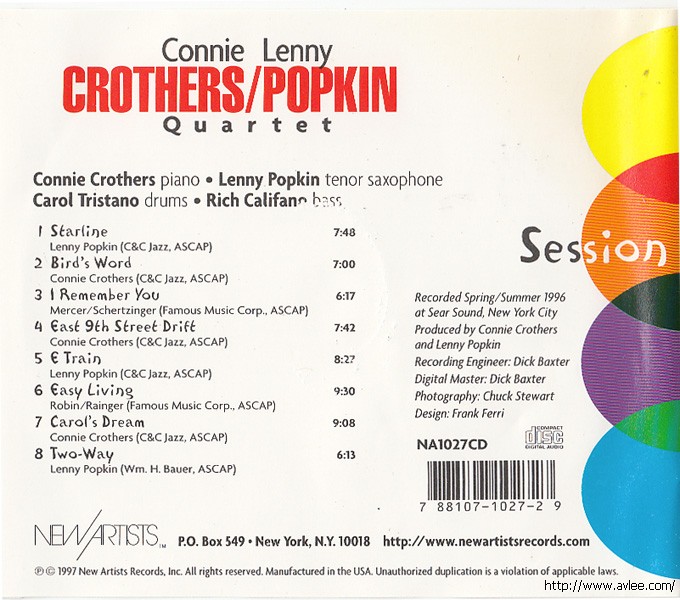 JAZZCD名称:Session艺术家名称:Connie Crothers – Lenny Popkin Quartet发行公司:NEW ARTISTS发行编号:NA1027CD发行日期:1997年