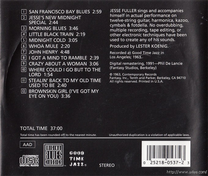 JAZZCD名称:San Francisco Bay Blues艺术家名称:Jesse Fuller发行公司:GOOD TIME JAZZ发行编号:OBCCD-537-2发行日期:1963年