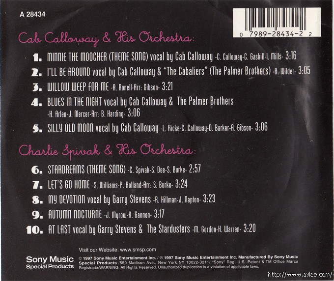 JAZZCD名称:The Best of the Big Bands艺术家名称:Cab Calloway & Charlie Spivak发行公司:Sony Special Products发行编号:A 28434发行日期:1997年