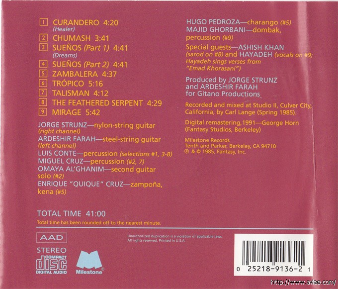 JAZZCD名称:Guitarras艺术家名称:Strunz & Farah发行公司: Milestone发行编号:MCD-9136-2发行日期:1985年