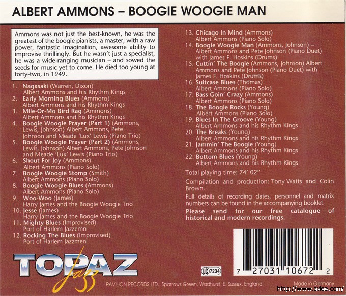 JAZZCD名称:Boogie Woogie Man艺术家名称:Albert Ammons发行公司:TOPAZ JAZZ发行编号:TPZ 1067发行日期:1997年