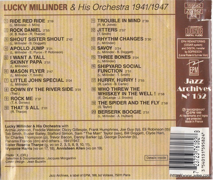 JAZZCD名称:Jumpin' at the Savoy Featuring Sister Rosetta Tharpe 1941/1947艺术家名称:Lucky Millinder & His Orchestra 发行公司:EPM发行编号:159582发行日期:1999年