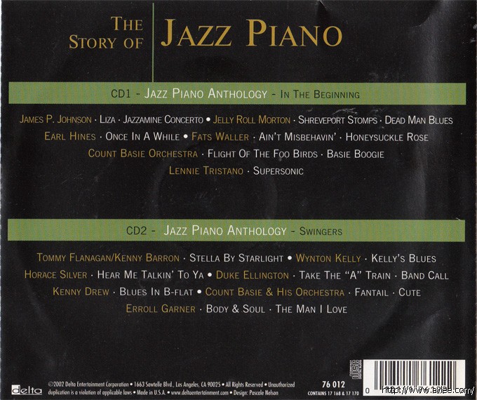JAZZCD名称:Jazz Collection: The Story of Jazz Piano艺术家名称:Various Artists发行公司:DELTA发行编号:76 012发行日期:2002年
