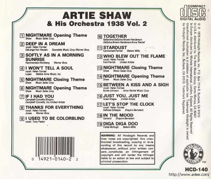 JAZZCD名称:The Uncollected Artie Shaw & His Orchestra, Vol. 2: 1938艺术家名称:Artie Shaw发行公司:Hindsight Records发行编号:HCD-140发行日期:1979年