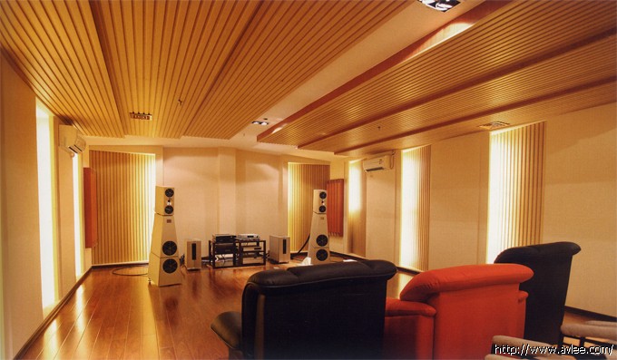 起初,李积回只是在家“摆弄”音箱器材,从2005年,他便开始利用阳江十八子集团的营业大厦空闲空间,建设“十八 子视听会馆”。2000多平方米的会馆,分为两大部分,一部分由15间大小不一、各具特色的私人视听室构成,另一部分则展示了品种齐全的音响器材和黑胶碟珍藏。他不断邀请众多的发烧友和各界人士试听他的“宝贝”,鉴赏各种美妙的音乐曲目,以乐会友。 通过多次现场音乐会的亲身体验,李积回发现音乐厅的现场音乐会虽然声音最为自然真实,但是也有聆听环境嘈杂、聆听位置不够理想的限制,而且很多已经辞世的音乐大师的表演,也只能通过音乐软件才能进行欣赏。所以建造几间声音表现中性客观的听音室,然后通过不同的音响器材搭配,来实现“私人音乐厅”,随时邀请各位音乐大师来此“演出”,更加符合自己欣赏音乐的诉求:“一套音响,就好比一位音乐家,让你在家中,就可以像在音乐厅中一样,听到很多艺术作品了。” 为了能够达到心目中“私人音乐厅”的标准,打造最客观的听音室,他请来了业内著名的音响空间设计师蒋晓东先生,为自己设计了其中13间听音室。除了选配音响器材外,设计师还根据他的要求,对每间房间进行细致的声学处理。步入这些听音室,首先映入眼帘的是高低不平的天花板。这些阶梯状高低起伏的天花板,可以有效地扩散传递到天花板上的声波,再配合上整间听音室前后左右的墙面都挂有凹凸起伏的声波扩散板,可以让声波更均匀地在室内进行扩散。此外,这些扩散板都是倾斜安装的,使整间听音室的墙面都处于一种互相不平行的状态,进一步保证了房间的各种声学特征处于一种“和谐”的状态中。 另外在每间听音室的墙面上,还挂着一些上下有开口的方形木柱,这是听音室最重要的声学处理设备。表面上这五根木柱的长度是一样的,但其实在每根木柱里面不同高度,都用隔板进行了分隔,使其成为了长短不一的“共鸣管”。这些共鸣管能够吸收听音室过多的低频,让整间听音室的频率曲线变得平直,使房间具有了更为客观中性的声音表现。有了这些按照声学原理进行改造的房间,李积回的听音室真正变成了一处可以最客观地回放那些伟大艺术家的音乐录音的“私人音乐厅”。另外2间由他自己亲自设计并搭建的听音室,他更青睐有加,“利用黑胶碟、VCD和DVD等软件来建声,原始的味道更有韵味;自己一点点测试出来的音响设备组合,更能唤醒自己的耳朵。”